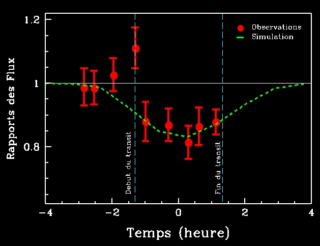 transite devant HD209458, le flux est plus faible d'environ 15% (trait rouge)